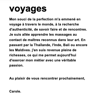 C'est exactement de cette manière que je perçois mon métier. Avec bien entendu un grand souci de perfection ainsi que de technique mais avant tout, avec le besoin de mettre dans mes soins de la qualité d'écoute et d'intention. Et ainsi, enrichir le bien-être de chacun de mes clients à travers leur corps mais également à travers leur être intérieur en touchant je l'espère leur coeur.
